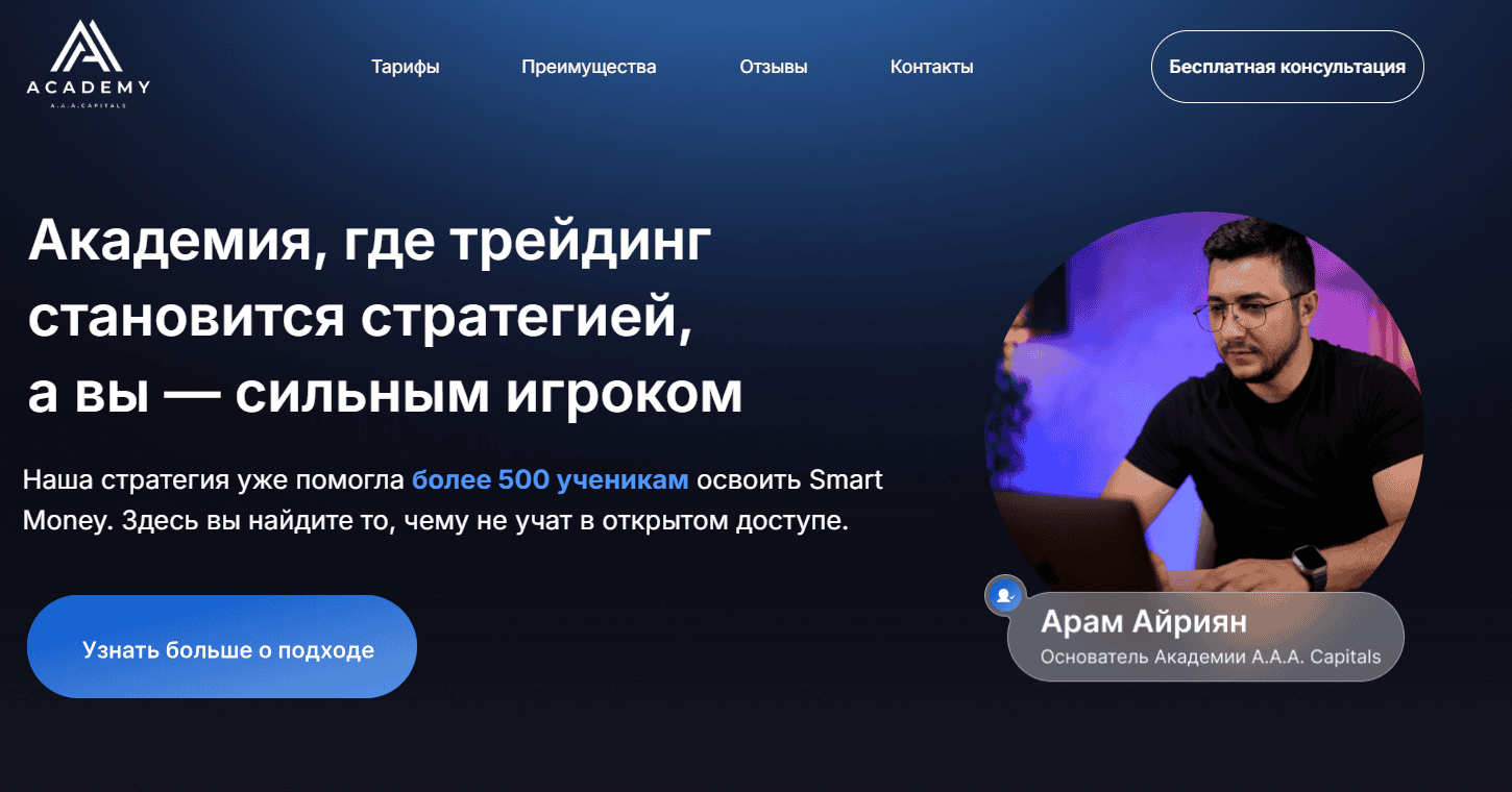 На рынке образовательных услуг всё больше проектов, которые обещают научить трейдингу и дать работающие стратегии для выхода на стабильный доход. Одним из таких проектов является AAA Capitals (aaacapitals30.com), основанный Армом Айрияном. Академия позиционируется как «место, где трейдинг становится стратегией, а вы — сильным игроком».