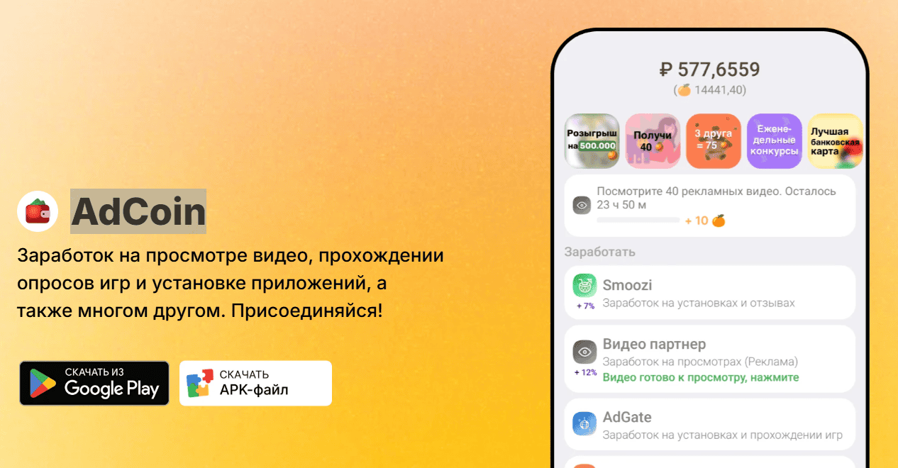 AdCoin позиционирует себя как мобильное приложение для заработка на простых действиях — просмотрах видео, установках приложений и прохождении опросов. На главной странице обещают всё, что любят новички: «Смотри видео — получай деньги. Выплаты моментальные».
