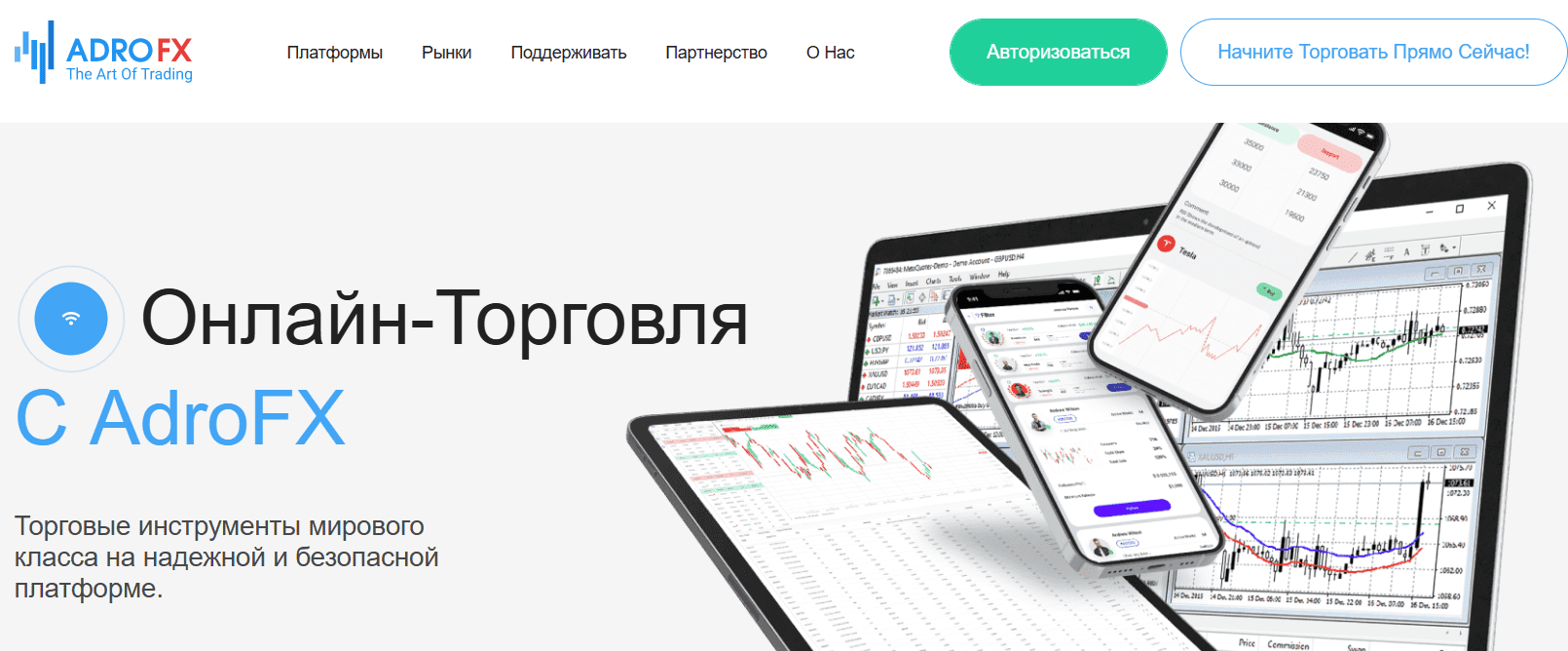 AdroFX активно использует маркетинговые элементы: красивые изображения платформ, обещания защиты средств, заявленные награды.