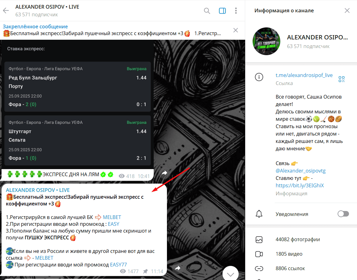 Канал насчитывает десятки тысяч подписчиков и оформлен в типичном стиле ставок-инфоциган. Автор, представляющийся «Сашей Осиповым», публикует скриншоты “выигрышных” экспрессов, красочные сообщения о «трёх миллионах на кону» и регулярно продвигает ссылки на букмекерскую контору Melbet с промокодом EASY.