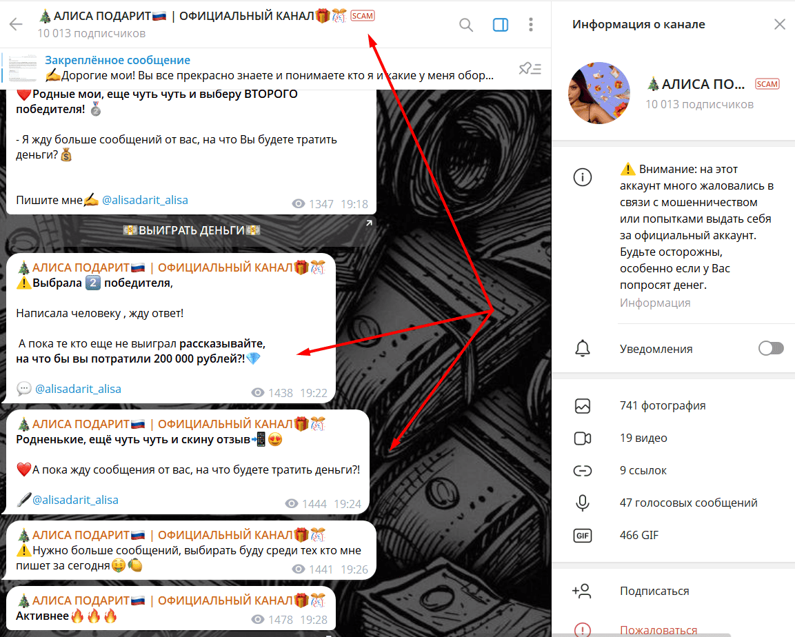 Канал «АЛИСА ПОДАРИТ | ОФИЦИАЛЬНЫЙ КАНАЛ» — не розыгрыш, а мошеннический проект, использующий доверие, эмоциональное давление и фейковые отзывы для обмана пользователей.