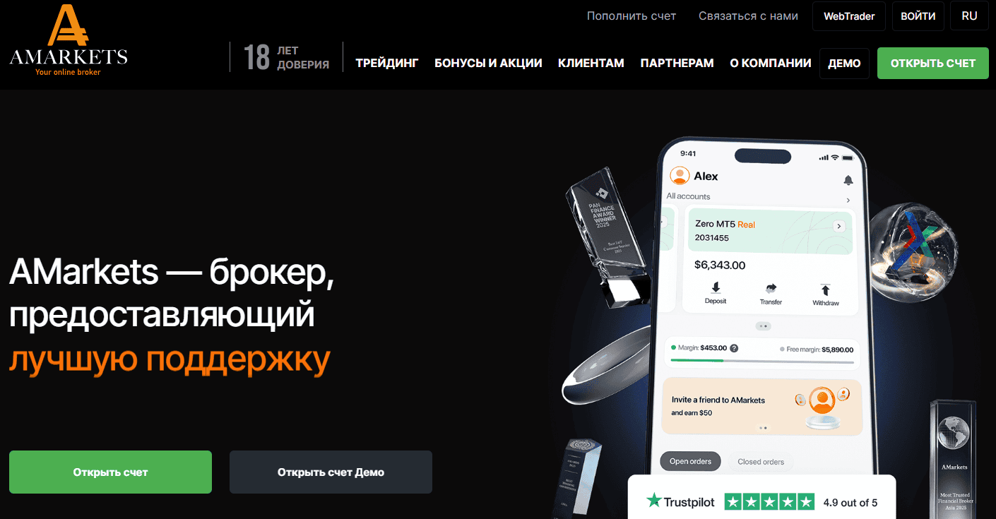 Официальный сайт — https://amarkets.org. Компания заявляет о многолетнем опыте, современной торговой платформе и защите интересов клиентов. Визуально проект выглядит солидно. Есть таблицы счетов, условия торговли, юридические документы. Но внешний вид — не гарантия надёжности.