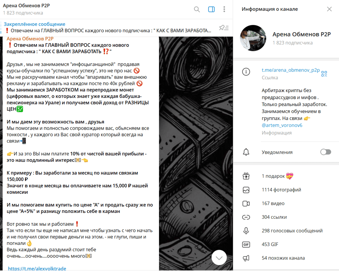 Арена Обменов P2P — проект, маскирующийся под криптоарбитраж и обучение, но не предоставляющий никаких доказательств своей деятельности. Заявления о “10% от прибыли” и “наставниках-кураторах” выглядят как типичная завлекающая формула, рассчитанная на доверчивых пользователей Telegram.