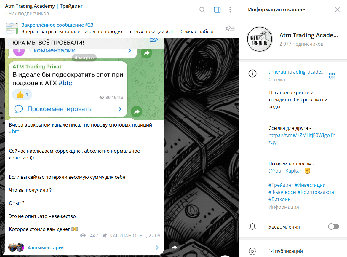 Канал Atm Trading Academy | Трейдинг — очередной пример того, как под видом «академии» пользователям предлагают доступ в платные чаты с сомнительной ценностью. Отсутствие лицензий, агрессивная реклама закрытых подписок и давление на эмоции аудитории указывают на риски.
