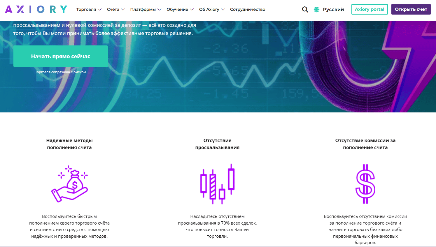 Компания Axiory позиционирует себя как международного брокера с многолетним опытом. На сайте указано, что платформа предлагает выгодные торговые условия, быстрое пополнение и отсутствие комиссий. Визуально сайт выглядит профессионально: минимализм, понятный интерфейс, грамотный перевод на русский язык. Всё это создаёт ощущение доверия, особенно у начинающих трейдеров.