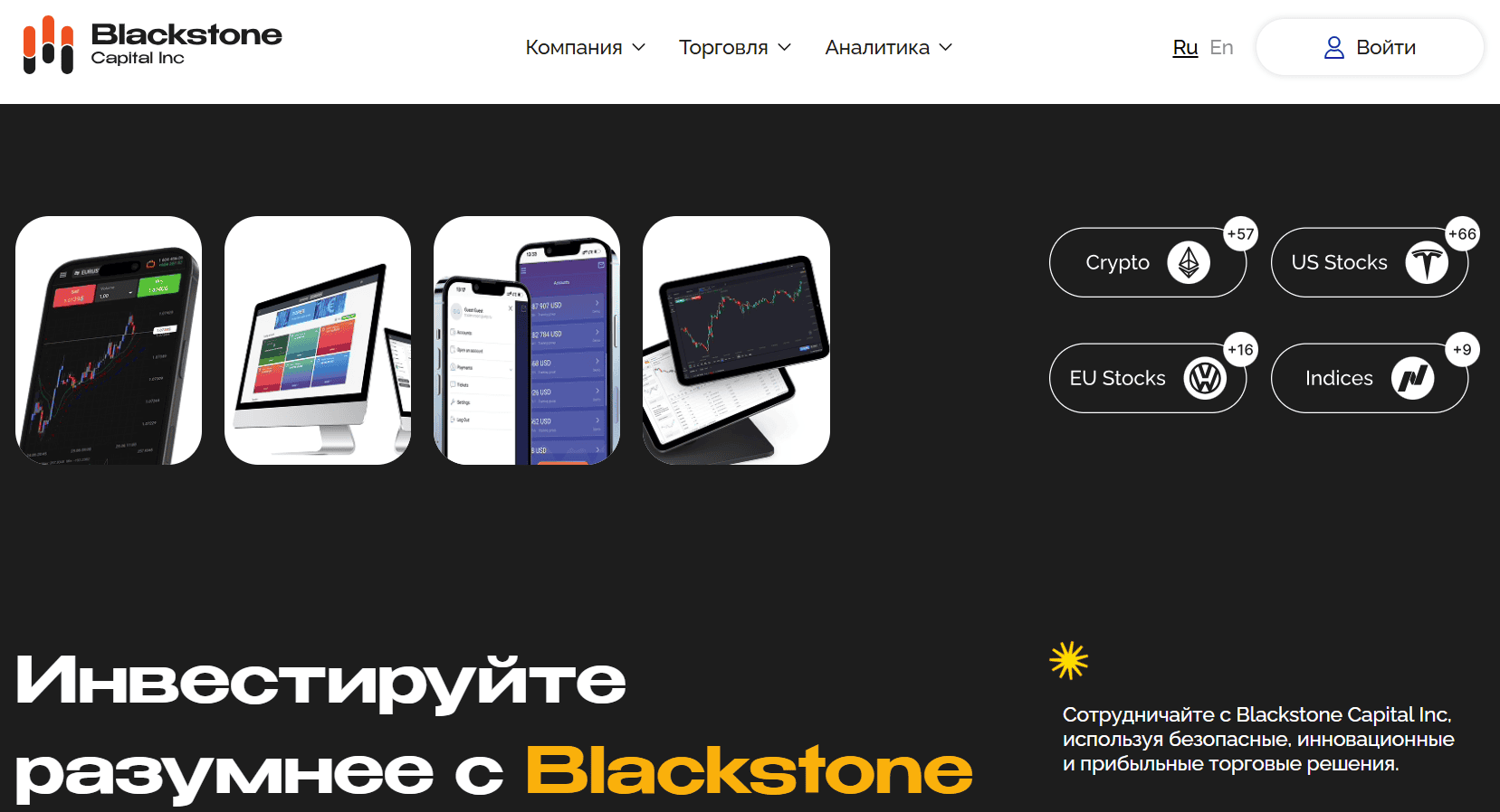 Брокер Blackstone Capital Inc позиционирует себя как инновационную платформу для торговли криптовалютами, акциями и индексами. На сайте заявлены сотни торговых инструментов, круглосуточная поддержка и миллионные обороты. Однако при внимательном анализе проект вызывает серьёзные сомнения в прозрачности и законности работы.
