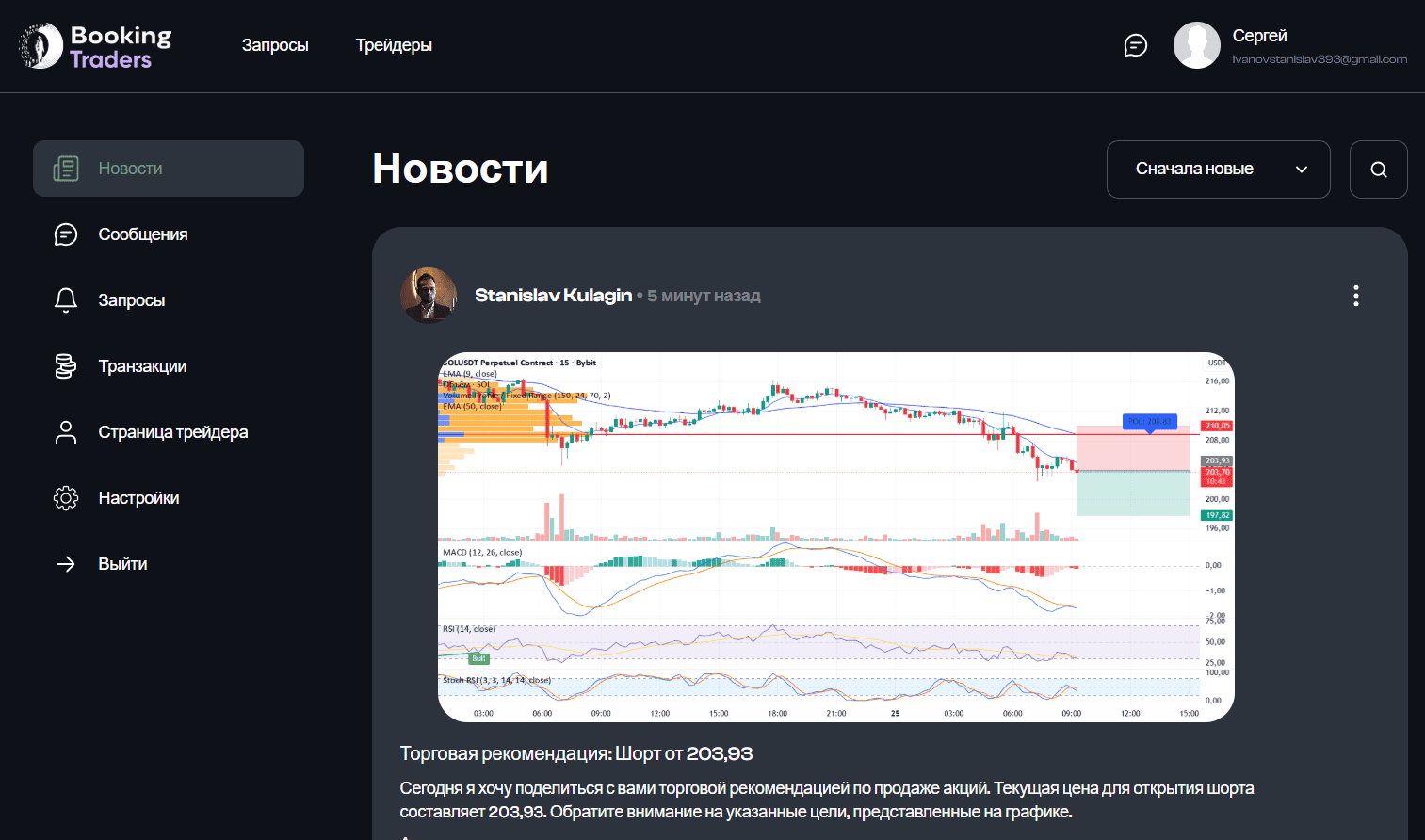 BookingTraders позиционирует себя как площадку для торговли и взаимодействия трейдеров. В интерфейсе присутствуют разделы «Новости», «Транзакции», «Запросы», «Страница трейдера», что создаёт впечатление полноценного брокерского кабинета.