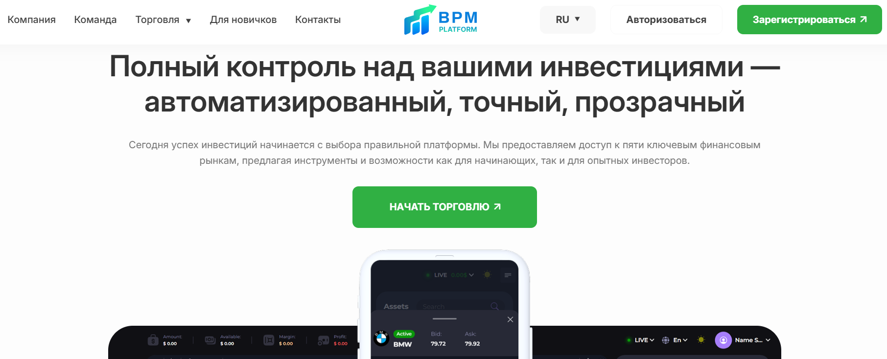 BPM Platform позиционирует себя как инновационную автоматизированную платформу для инвестиций с точными сигналами, прозрачностью и полным контролем над активами.