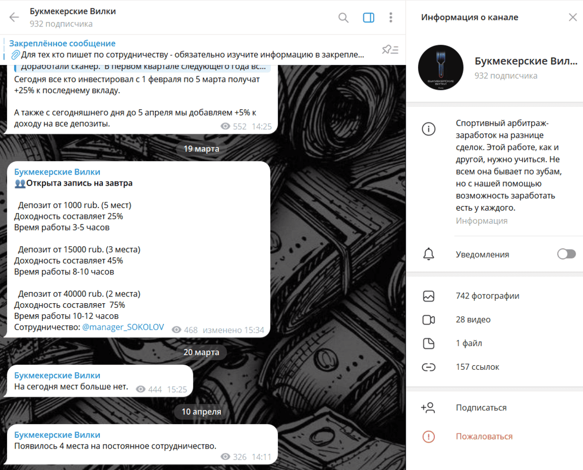 Канал «Букмекерские Вилки» — проект с ярко выраженными признаками мошеннической схемы. За обещаниями «арбитража ставок» скрывается сбор депозитов под видом «временной работы денег».