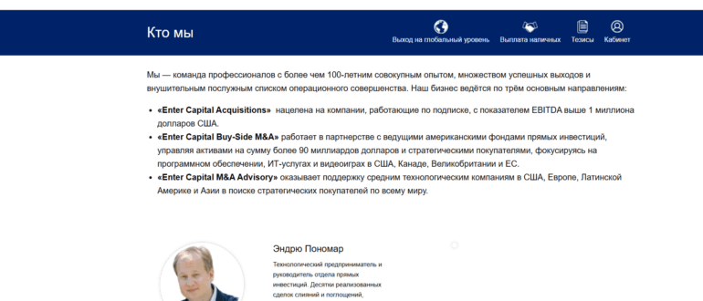 Платформа Enter Capital, представленная на сайте enter.capital, позиционирует себя как крупную инвестиционную компанию, работающую в сфере M&A, прямых инвестиций и управления активами. На сайте размещены заявления о многомиллиардных…