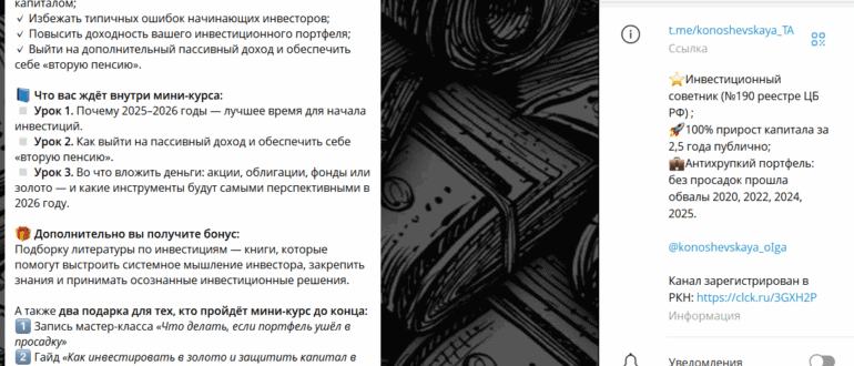 Проект «Ольга Коношевская | Технический анализ» активно продвигается как образовательная платформа и источник инвестиционной аналитики. Однако за красивыми формулировками о «100% приросте капитала», «антихрупких портфелях» и «инструментах, которые…