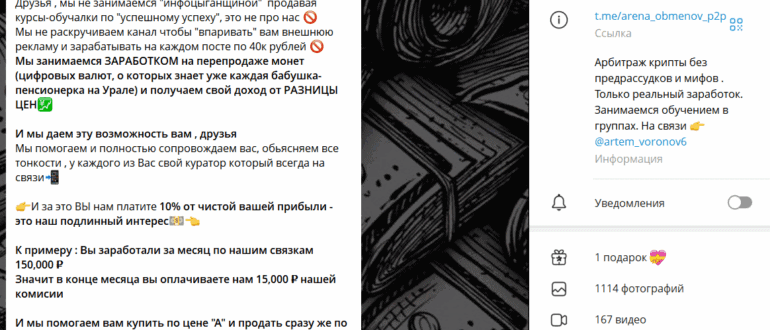 Канал Arena Obmenov P2P в Telegram позиционирует себя как “честную площадку арбитража криптовалют без курсов и обмана”. Его администраторы обещают пользователям стабильный доход на разнице цен между биржами,…