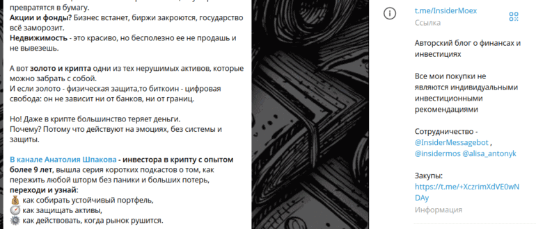 Инсайдер Мосбиржи — это Telegram-канал, который позиционирует себя как «авторский блог о финансах и инвестициях». На первый взгляд, кажется, что здесь делятся аналитикой по рынку, акциями и новостями…