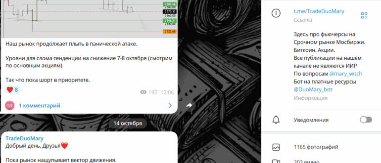 В Telegram-канале TradeDuoMary публикуются материалы о торговле фьючерсами на Московской бирже, а также аналитика по акциям и криптовалютам. Проект представлен двумя женщинами, которые позиционируют себя как профессиональных трейдеров…