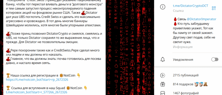 Канал Dictator Crypto насчитывает более 36 тысяч подписчиков и позиционируется как «закрытое сообщество для избранных». На первый взгляд, это пространство с элементами элитарности, загадочными текстами и намёками на…