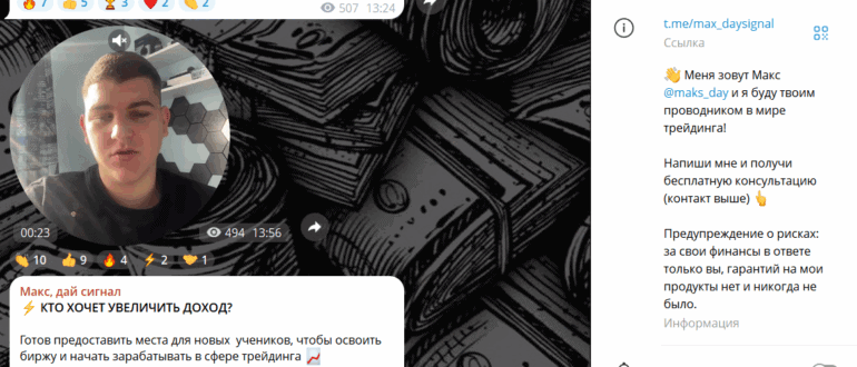 Канал «Макс, дай сигнал» насчитывает около 6 тысяч подписчиков и позиционируется как площадка, где новичкам помогут освоить трейдинг и «начать зарабатывать на бирже». Автор канала представляется как Макс…