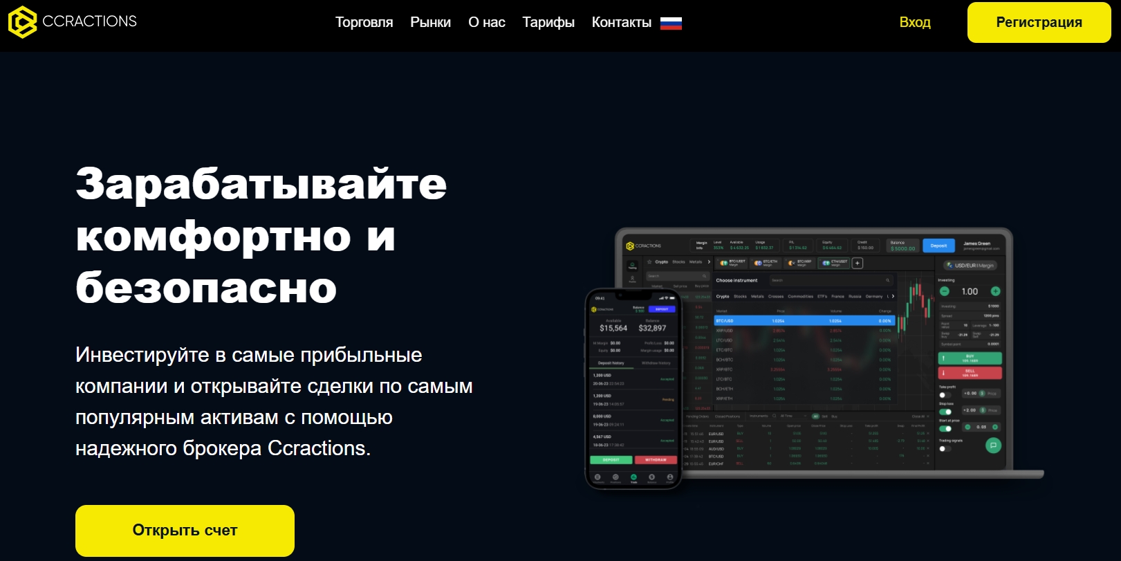 На главной странице Ccractions продвигает себя как «надёжный брокер». Среди ключевых обещаний: инвестиции в любые суммы, поддержка 24/7, быстрые операции. Моментальное исполнение, работа с криптовалютами, металлами и фондовым рынком.