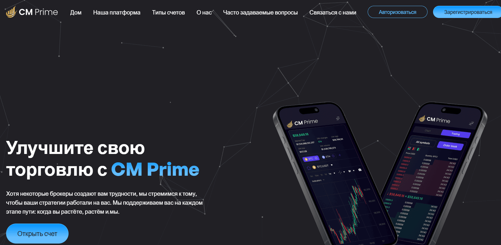 Интернет-платформа CM Prime (официальный сайт — cm-prime.co) позиционирует себя как брокерскую компанию, предлагающую услуги в области торговли на финансовых и криптовалютных рынках. На сайте указано, что брокер поддерживает работу с цифровыми активами и предоставляет клиентам доступ к различным инструментам — валютам, контрактам и инвестиционным продуктам.