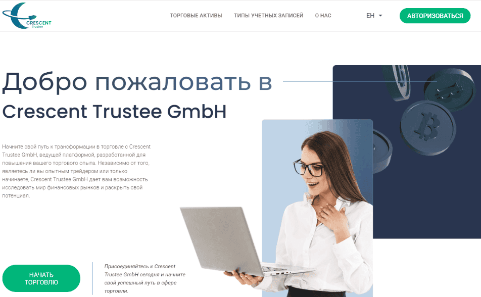 Официальный сайт: https://crescent-trustee.com. На главной странице — стандартный набор маркетинговых обещаний. Есть разделы с торговыми активами, типами учетных записей и «о нас». Визуально всё сделано аккуратно. Но дизайн не заменяет лицензии и юридическую прозрачность.