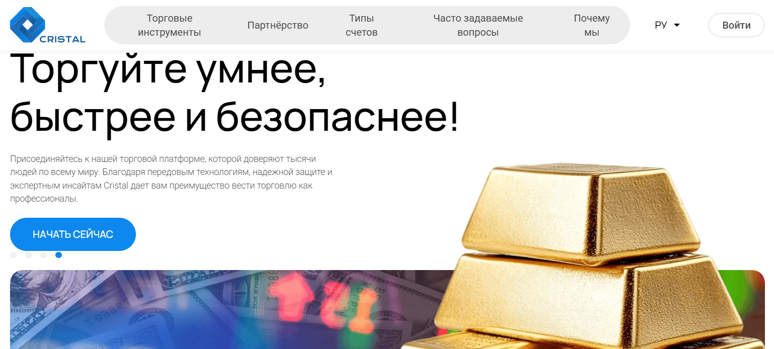 Cristal Platform подаёт себя как международного брокера с «передовыми технологиями», «нулевыми спредами» и «безопасной торговлей». На сайте размещены многочисленные награды, громкие заявления, впечатляющие цифры оборота и стандартная для псевдоброкеров риторика о «тысячах профессионалов».