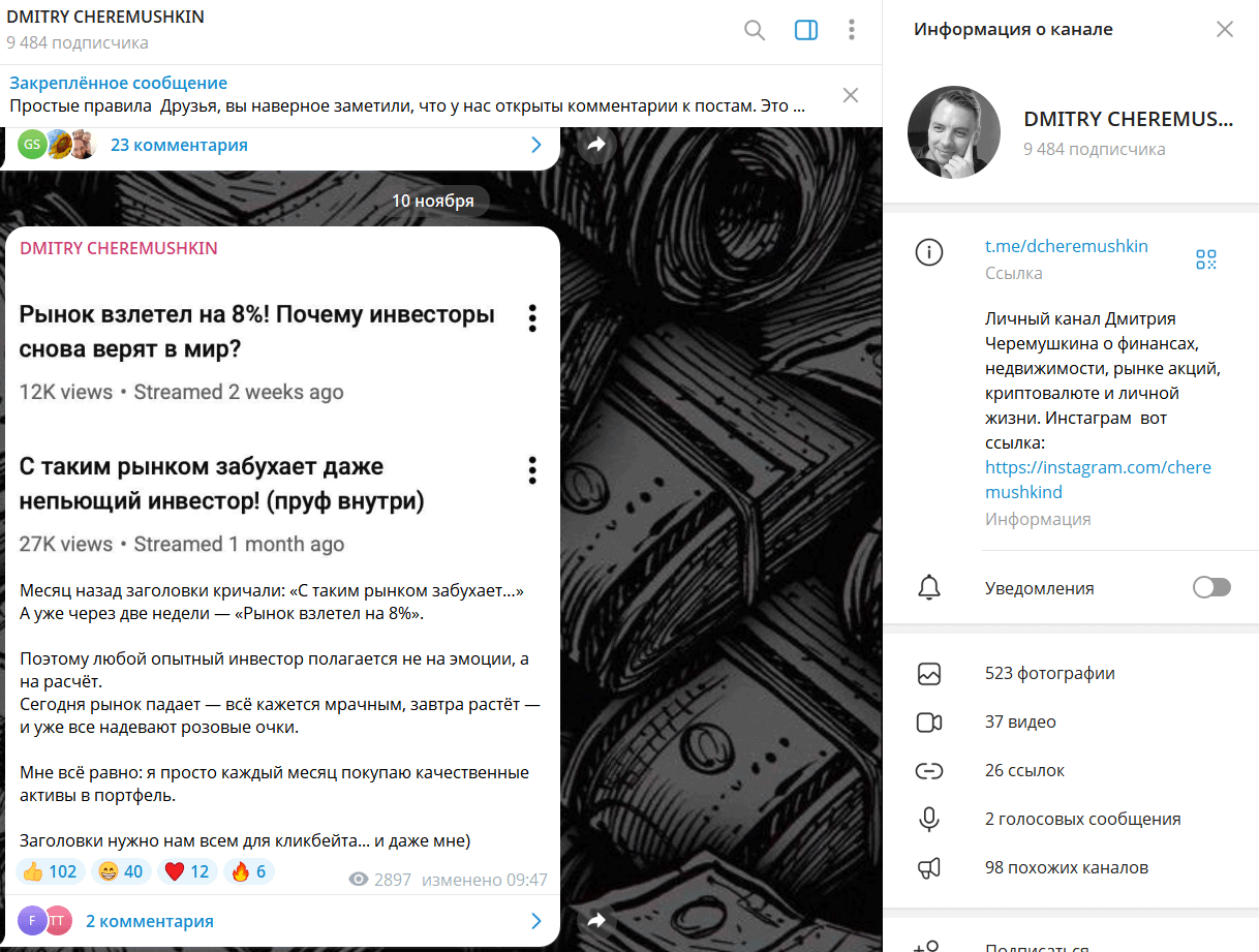 В Telegram всё чаще появляются “финансовые эксперты”, обещающие научить любого человека “грамотно инвестировать” и “зарабатывать на рынке”. Один из самых известных — Дмитрий Черемушкин, владелец канала DMITRY CHEREMUSHKIN, где он рассказывает о фондовом рынке, криптовалютах и “финансовом мышлении”.