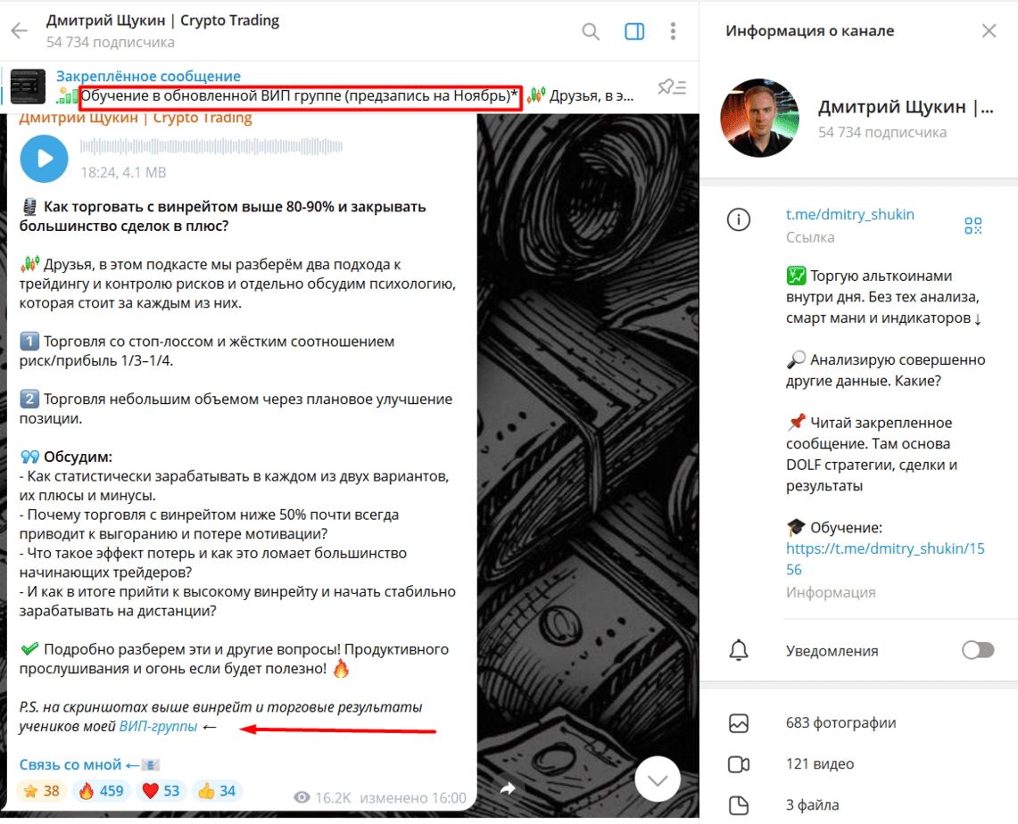 В Telegram набирает популярность канал «Дмитрий Щукин | Crypto Trading», где автор позиционирует себя как опытного криптотрейдера и наставника. Он обещает научить любого зарабатывать на рынке с винрейтом 80–90%, приглашает в свою VIP-группу, публикует подкасты и мотивирующие посты. На первый взгляд — профессиональное сообщество.