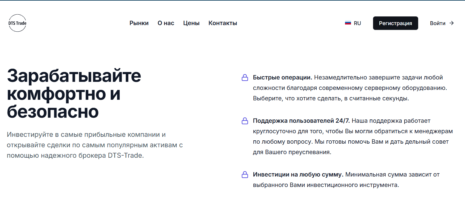 Рынок онлайн-трейдинга привлекает внимание тысяч инвесторов, но вместе с реальными брокерами на нем активно появляются и сомнительные проекты. Одним из таких является DTS Trade, позиционирующий себя как надежная компания для торговли популярными активами. Сайт обещает «зарабатывать комфортно и безопасно», круглосуточную поддержку и инвестиции «на любую сумму». Однако факты говорят об обратном.