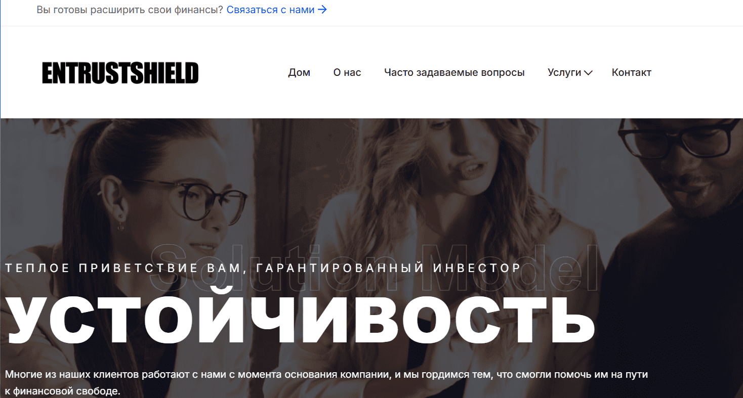 Entrustshield позиционирует себя как международную инвестиционную и консалтинговую компанию. На сайте заявляется, что компания якобы зарегистрирована в Комиссии по ценным бумагам и биржам США. Также указывается работа более чем в 100 странах и наличие тысяч клиентов.