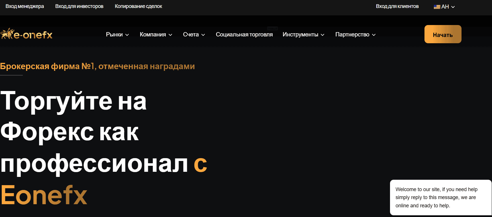 Компания Eonefx позиционирует себя как крупного и награждённого форекс-брокера. На сайте представлены премии, обещания профессиональной торговли и уверенные заявления о международной регуляции.
