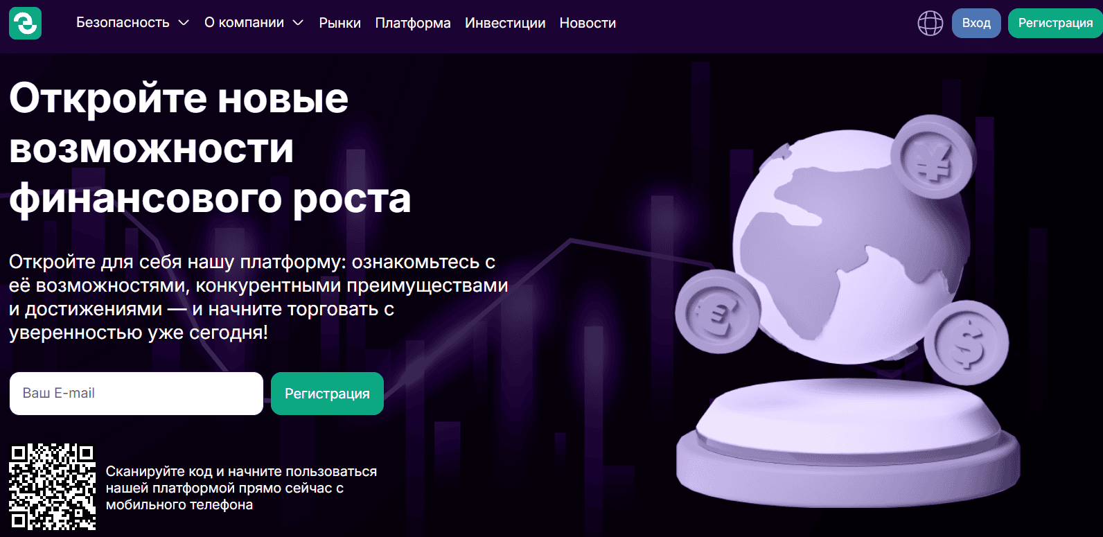 Посетителю предлагают зарегистрироваться, указав e-mail, или воспользоваться QR-кодом для скачивания приложения на смартфон. Уже на этом этапе создаётся впечатление простоты и доступности — будто инвестировать сможет любой пользователь «сегодня и без рисков».