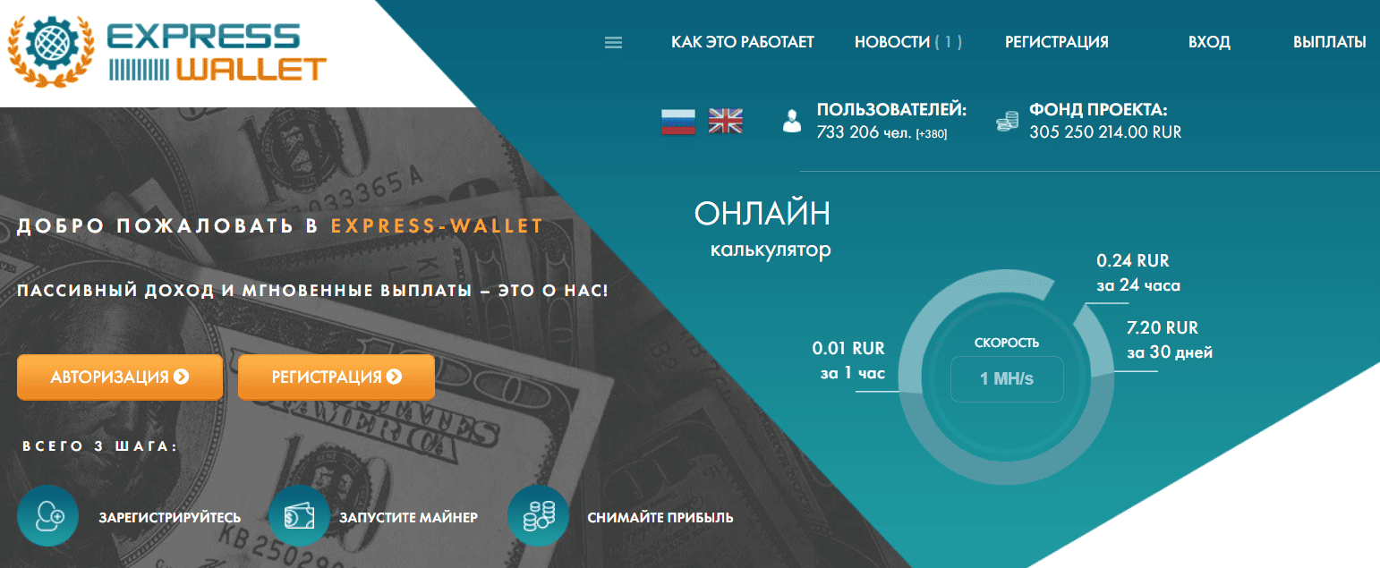 На сайте Express Wallet обещают стабильный доход, мгновенные начисления и простоту использования. Интерфейс выглядит нарочито “официально” — графики, статистика, онлайн-калькулятор, счётчик пользователей (более 700 000 человек!) и огромный «фонд проекта» на 305 млн рублей.