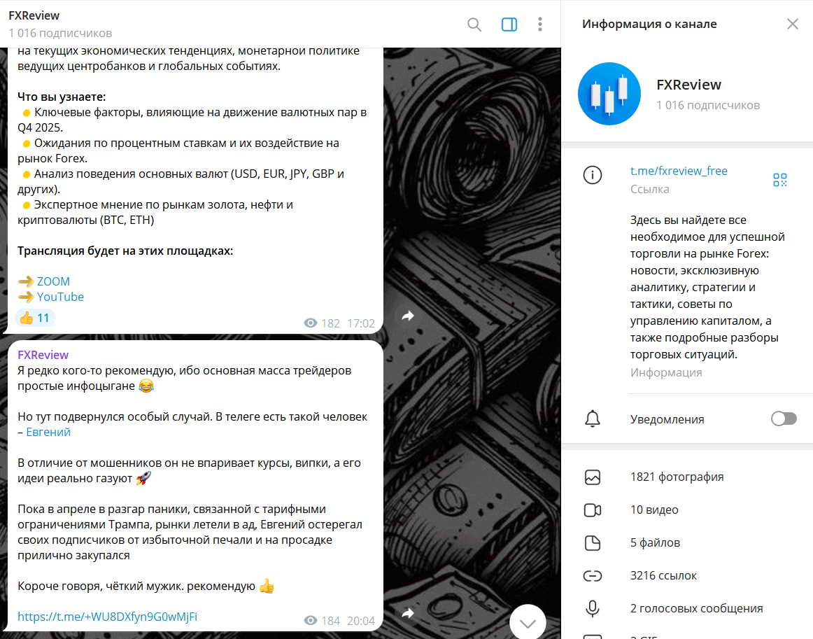 Одним из подобных каналов является FXReview, который позиционирует себя как площадку с аналитикой, стратегиями и обзорами торговых ситуаций. Однако за красивыми обещаниями скрывается типичная схема вовлечения пользователей в сомнительные истории.