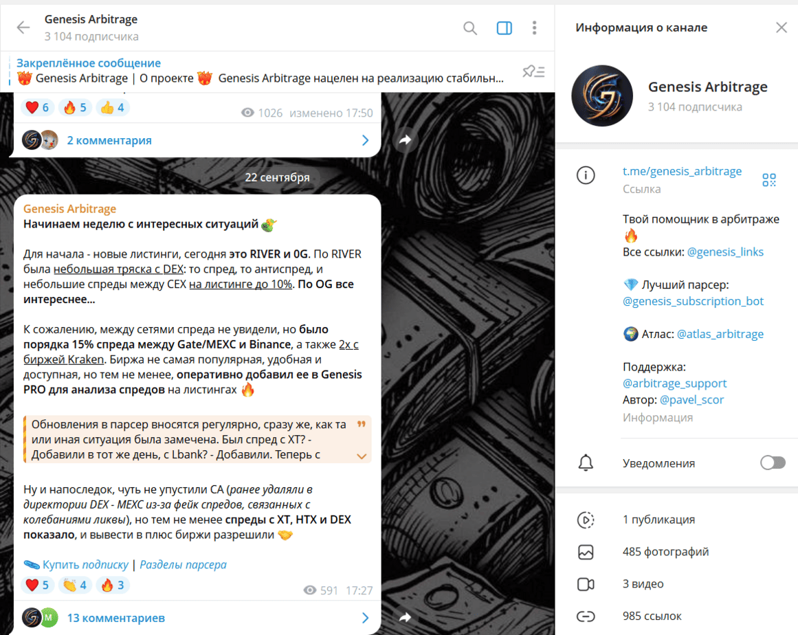 Genesis Arbitrage — это канал, основной задачей которого является продвижение собственного парсера и платных подписок. Для новичков криптоарбитраж через такие проекты почти всегда оборачивается потерями, а не прибылью. Подписываться на канал можно лишь в ознакомительных целях, но использовать его как основу для заработка крайне рискованно.