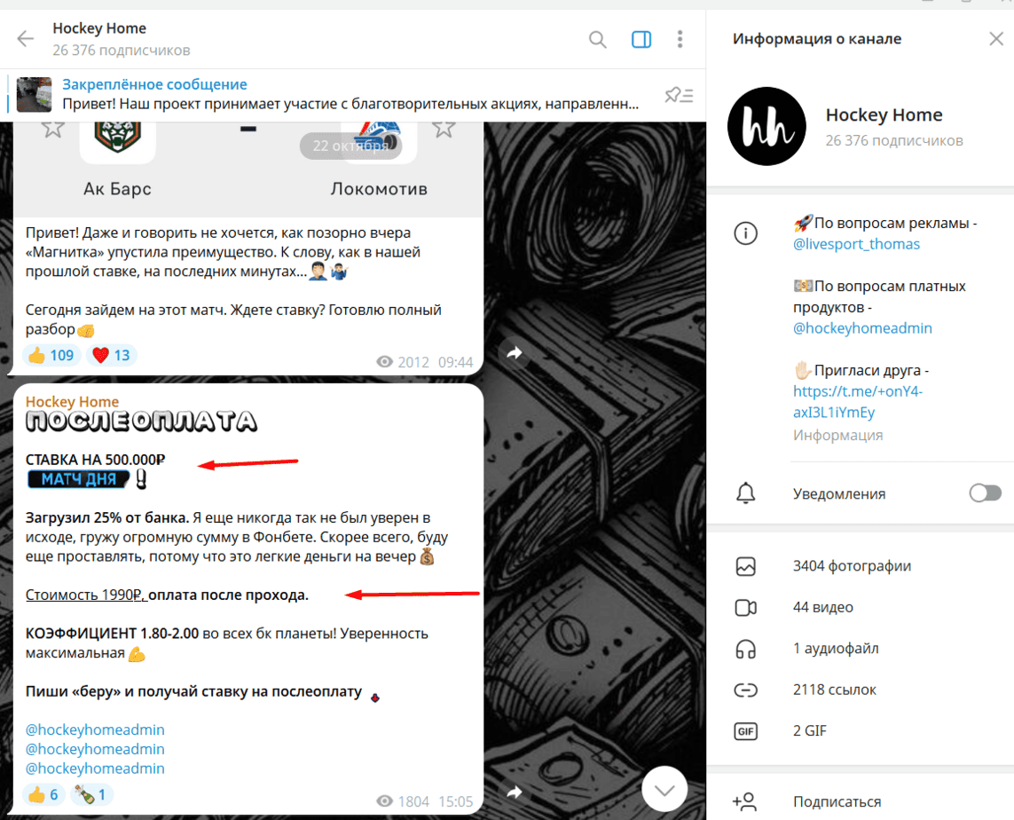Для постоянных клиентов предусмотрена “подписка” — 1000 рублей в неделю или 3000 рублей в месяц. Все расчёты проходят через личные сообщения администратора (@livesport_thomas или @hockeyhomeadmin), без каких-либо гарантий и прозрачных условий.