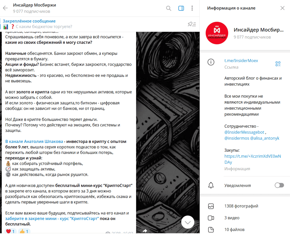 “Инсайдер Мосбиржи” — типичный пример Telegram-канала, который маскируется под экспертный источник информации, но фактически занимается продвижением сомнительных инвестиционных схем.
