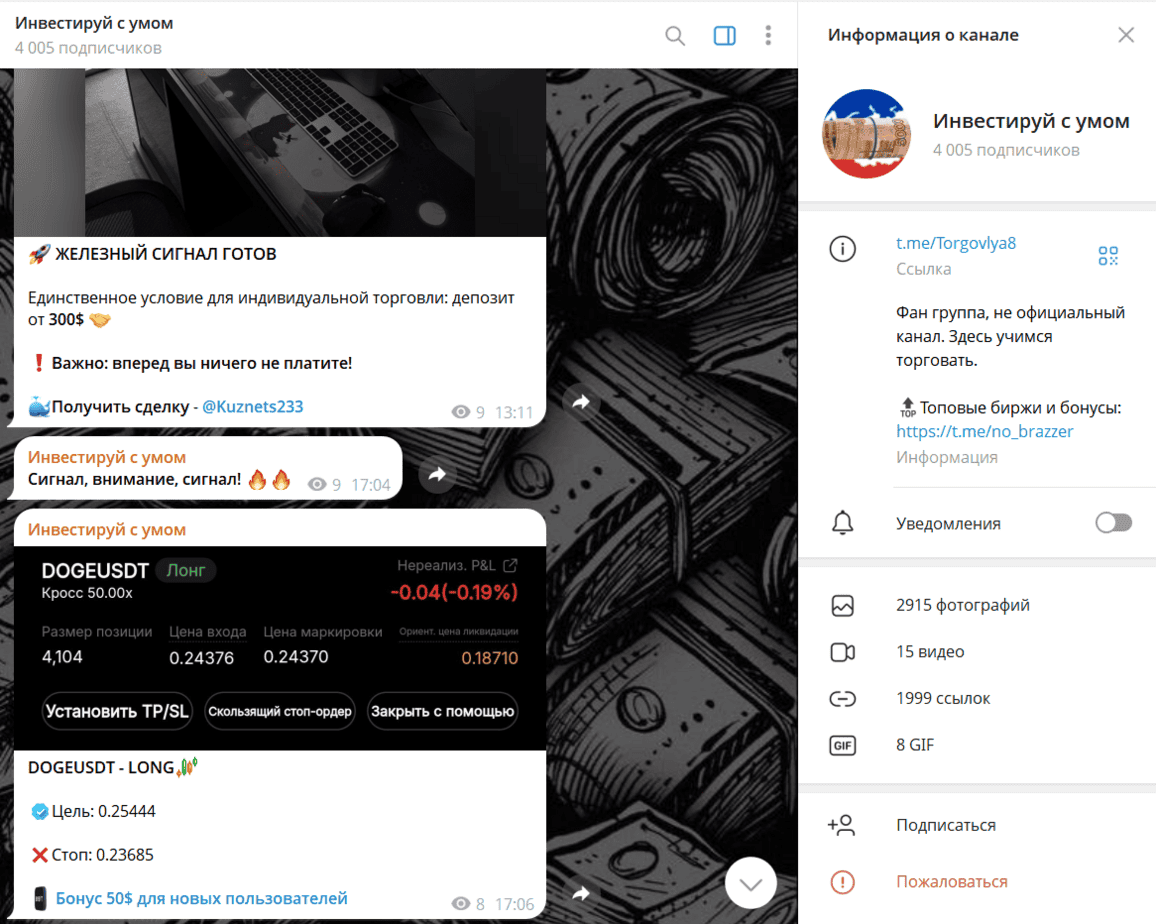 Телеграм-канал «Инвестируй с умом» привлекает к себе внимание громкими обещаниями. Админы позиционируют проект как «фан-группу для обучения торговле», но уже первые посты на главной странице дают понять, что речь идет не о настоящем обучении, а о типичной схеме с платными или условно бесплатными сигналами.