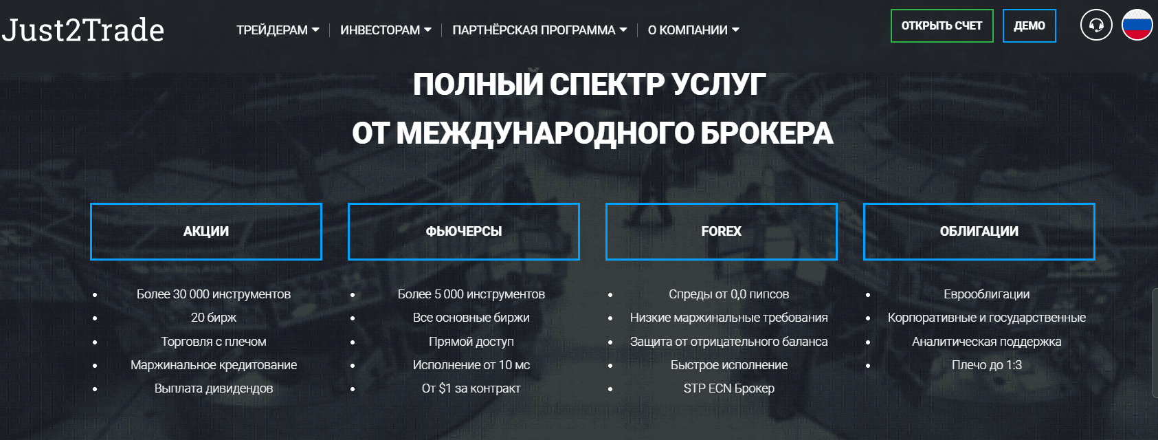 Just2Trade предлагает клиентам доступ к: более чем 30 000 акций, фьючерсам на крупнейших мировых биржах, рынку Forex с ECN-доступом.