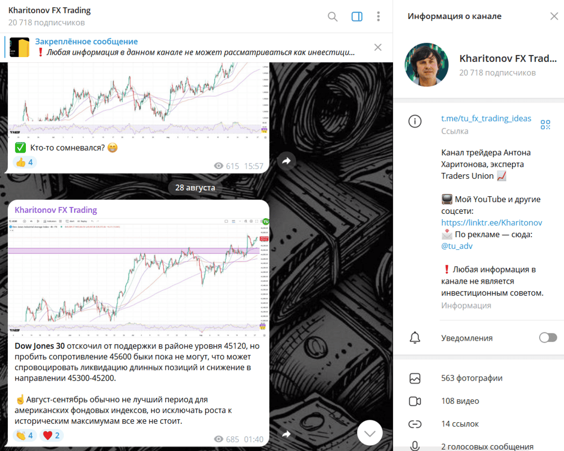 Канал Kharitonov FX Trading насчитывает более 20 тысяч подписчиков. Основной контент — посты с графиками, уровнями поддержки и сопротивления, комментариями по американским индексам и валютным парам.