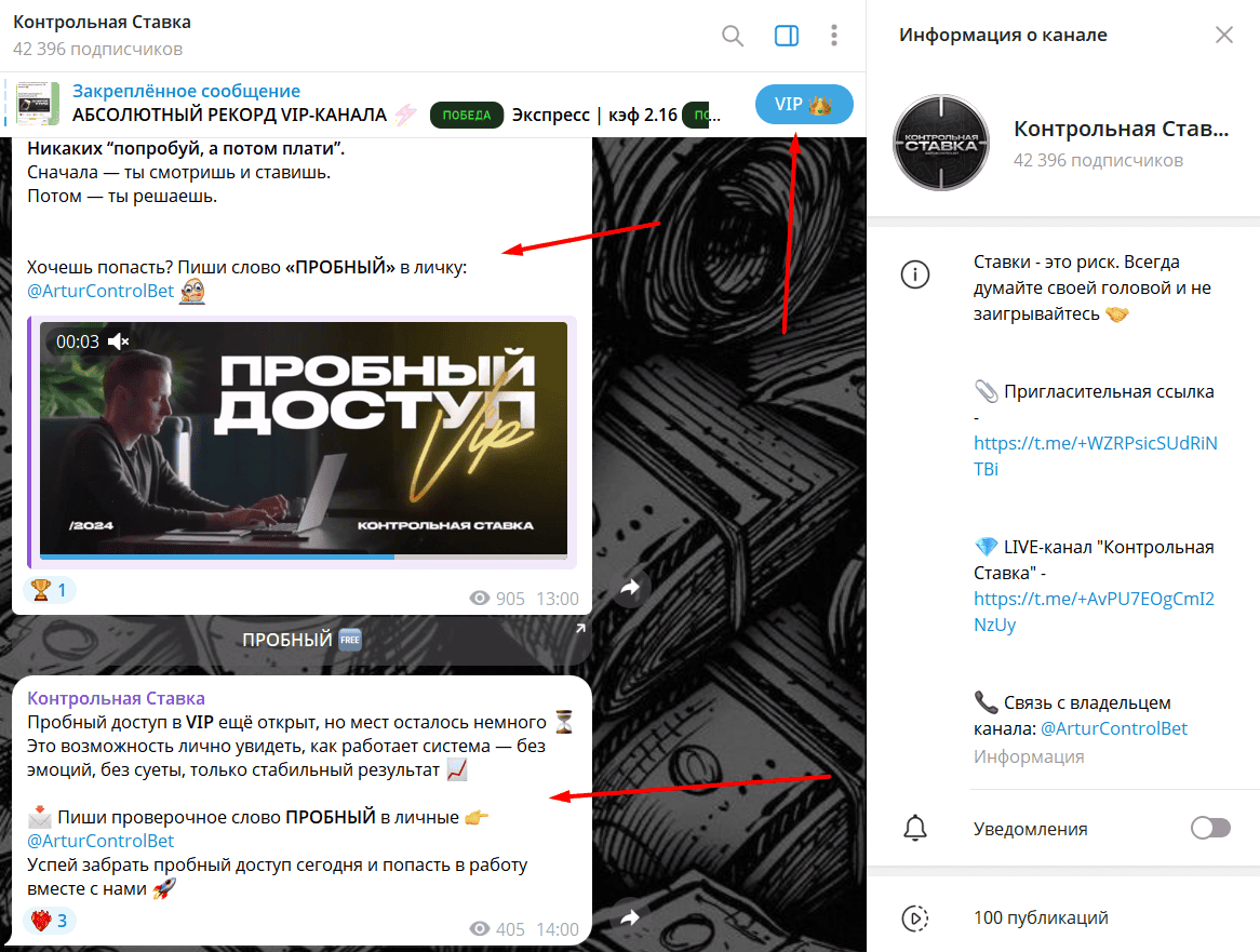- написать слово “ПРОБНЫЙ” или “VIP” в личные сообщения куратору @ArturControlBet;