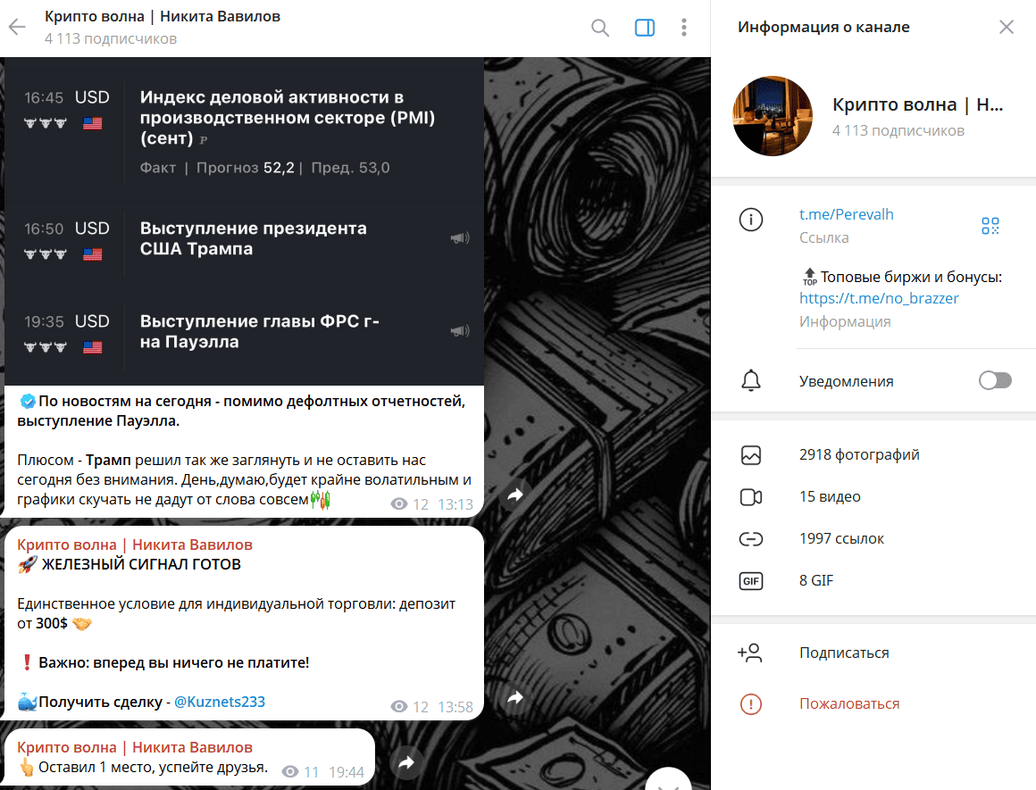Канал «Крипто Волна | Никита Вавилов» (t.me/Perevalh) привлекает внимание сочетанием новостной аналитики и обещаний эксклюзивных сигналов. На первый взгляд кажется, что автор действительно делится важными данными о рынке: публикуются индексы деловой активности, упоминаются ключевые события вроде выступлений президента США или главы ФРС. Такой новостной фон создаёт ощущение экспертности и серьёзного подхода.