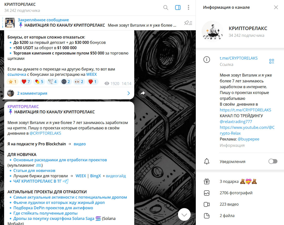 Мир криптовалют сегодня наполнен информацией: сотни каналов в Telegram ежедневно публикуют «сигналы», «аналитику» и обещают быстрый заработок. Однако далеко не всегда за этим стоит реальная экспертиза — часто речь идёт о банальном продвижении партнёрских ссылок и схемах с высокой долей риска. Один из популярных каналов — КРИПТОРЕЛАКС, насчитывающий более 34 тысяч подписчиков.