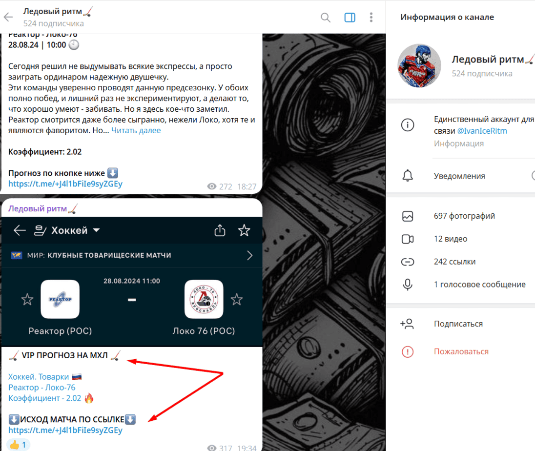 В последние месяцы всё чаще появляются телеграм-каналы, обещающие «железобетонные» ставки на спорт и гарантированные выигрыши. Один из них — «Ледовый ритм». Его автор уверенно публикует прогнозы на хоккейные матчи, чаще всего с громким тегом «ВИП», подчёркивая якобы «инсайдерскую» информацию от проверенных источников.