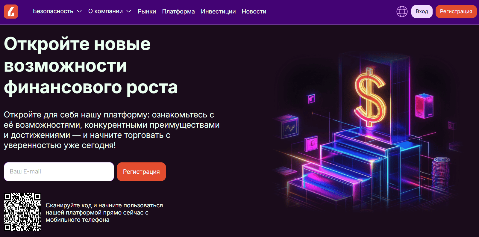 На сайте — ни имён руководителей, ни юрлица, ни адреса офиса. Форма обратной связи и QR-код для «мобильного входа» — всё, чем располагает пользователь. Это типичная стратегия анонимных брокеров, которые собирают депозиты, а затем исчезают вместе с деньгами.