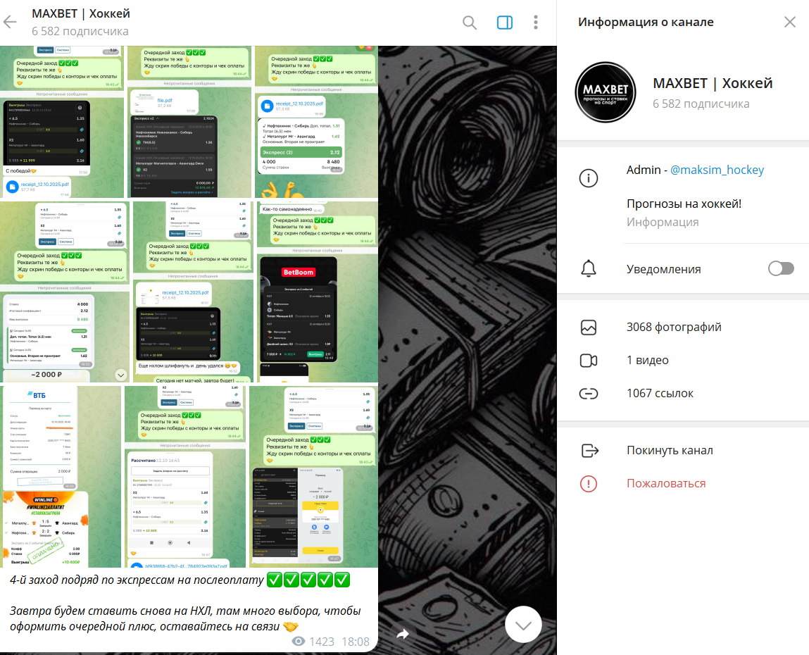 Канал MAXBET | Хоккей продвигает себя как сообщество, где якобы публикуются точные прогнозы на хоккейные матчи. Администратор под ником @maksim_hockey, обещает подписчикам «ежедневные экспрессы» и лёгкий заработок без вложений.