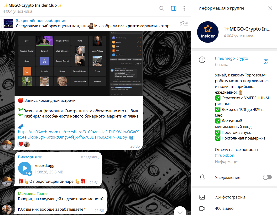 Визуально группа выглядит как профессиональное сообщество: регулярные Zoom-встречи, записи командных звонков, обсуждения новых монет и стратегии. Администраторы подают информацию уверенно, постоянно напоминают о «важных новостях» и подчёркивают сплочённость команды. В закреплённых сообщениях упоминаются бинарный маркетинг-план, торговые роботы, а также ссылки на сторонние ресурсы.