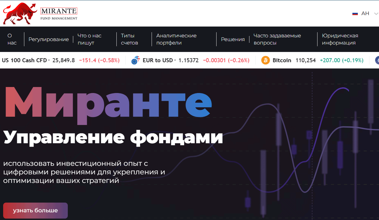 Сайт Mirante Fund Management (mirante-fund-management.com) на первый взгляд выглядит как типичная инвестиционная платформа премиум-класса. Глянцевый дизайн, графики, обещания профессионального управления активами и даже отдельные тарифы с «аналитиком» и «персональным менеджером». Но за этим фасадом скрывается очередная схема по выманиванию денег.