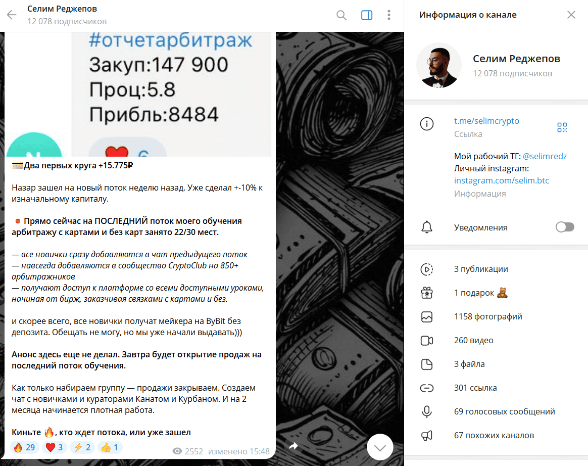 Телеграм-канал Селим Реджепов насчитывает более 12 тысяч подписчиков и активно рекламируется как площадка для «обучения арбитражу картами и без карт». На первый взгляд, автор подает себя как опытного наставника, готового научить заработку на финансовых потоках.