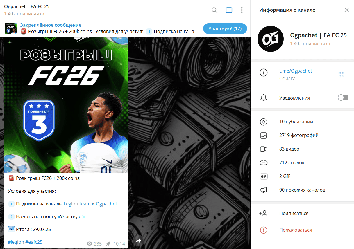 Сегодня Telegram полон каналов, которые заманивают подписчиков обещаниями легких призов и эксклюзивных бонусов. Одним из таких проектов стал «Ogpachet | EA FC 25», посвящённый популярному футбольному симулятору. На первый взгляд, здесь царит атмосфера комьюнити: новости об игре, конкурсы, общение геймеров. Но если присмотреться — многое вызывает вопросы.