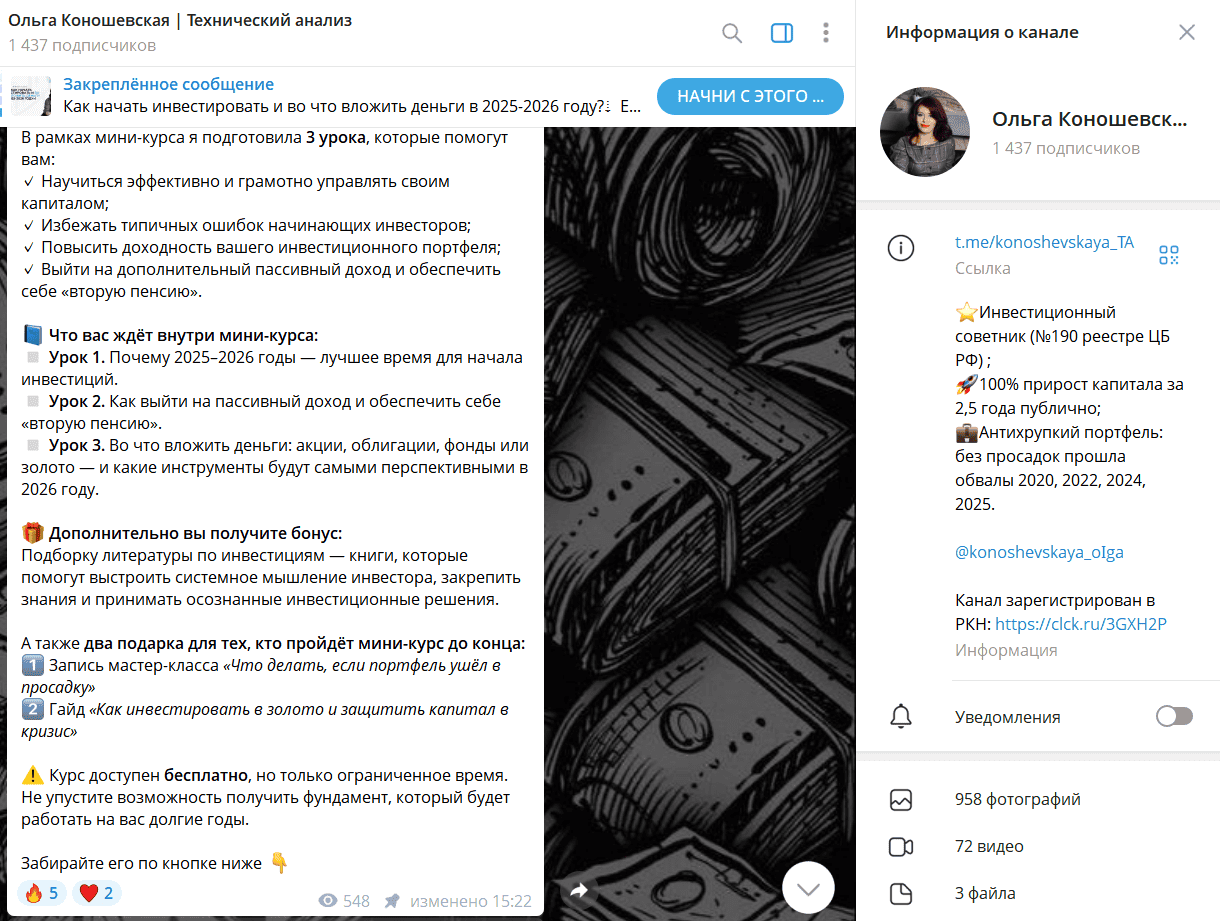 Проект «Ольга Коношевская | Технический анализ» активно продвигается как образовательная платформа и источник инвестиционной аналитики. Однако за красивыми формулировками о «100% приросте капитала», «антихрупких портфелях» и «инструментах, которые работают всегда» скрывается типичная инфо-воронка, построенная на манипуляциях и продаже иллюзий.