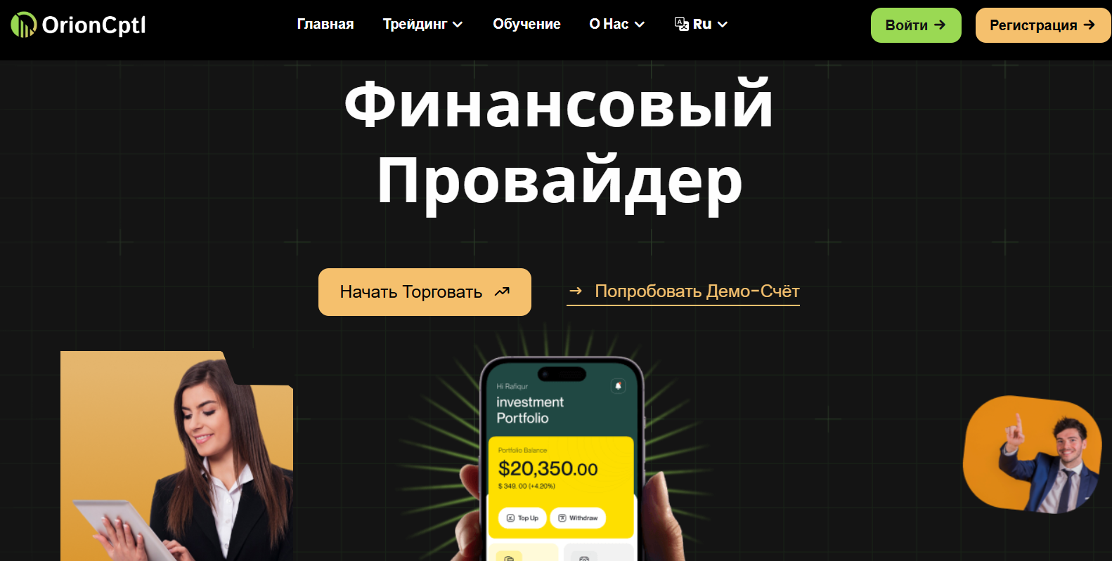 Платформа OrionCptl (orioncptl.com) позиционирует себя как современного финансового провайдера с доступом к мировым рынкам, обучением и «инновационной платформой». На главной странице — яркие баннеры, обещания удобного интерфейса и мгновенного доступа к рынку без скачиваний. Также заявлено более 400 инструментов и 100 000 клиентов.